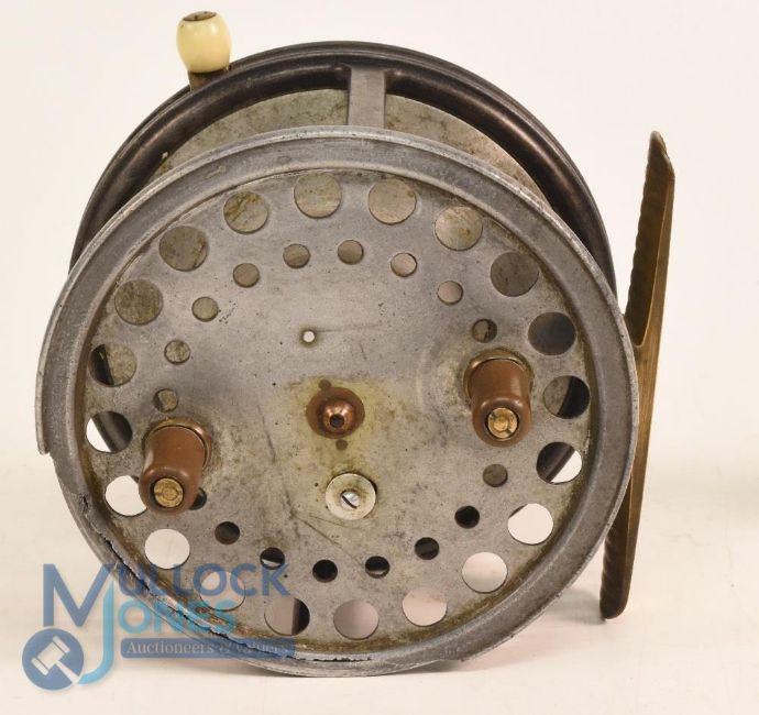 Hardy Bros "The Super Silvex" alloy casting reel 4 1/2" extra wide spool (missing 4" spool rim), sliding spool latch, twin handles, ivorine rim mounted on/off check lever, milled rim tensioner with ivorine gauge, full brass ribbed foot. Needs a good clean