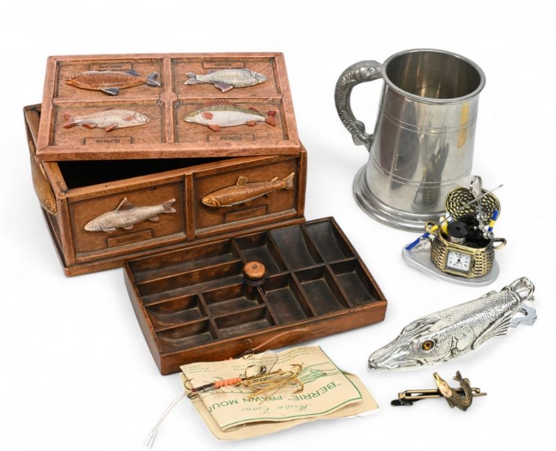 Fishing Collectables to include a pewter fishing mug, pike paper clip, pike tie clip, small quartz clock in the shape of a fishing creel with contents, plus a resin fish box containing hooks