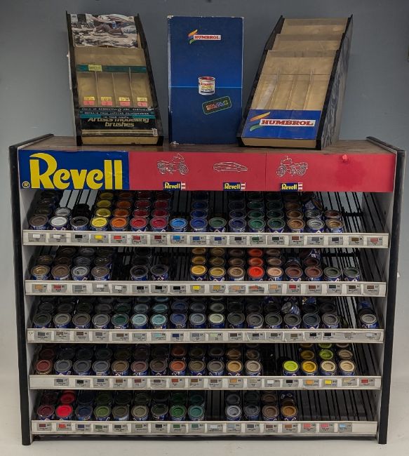 Vintage Model Shop Revell Paint Display Stands, with contents of unused paints (#280 unused tins) two brush stands and a Humbol colour cart guide. Collection recommended