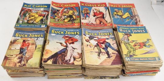 Great Collection of 1950s Cowboy Picture Library Featuring Kid Carson, Davy Crocket, Kansas Kid, Buck Jones all having 3-digit numbers or less (box)