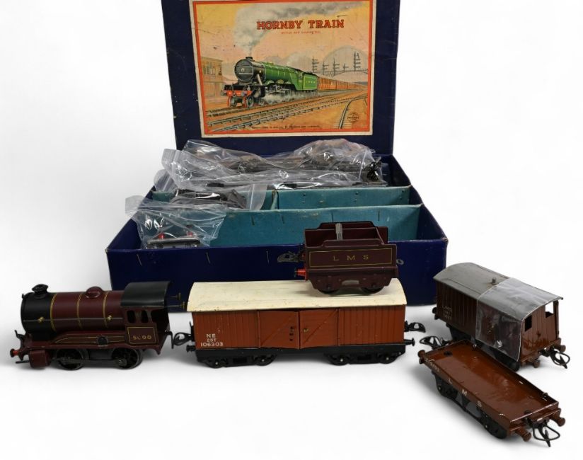 Hornby Clockwork O Guage No 601 Goods Set, to include LMS 5000 Locomotive and Tender with Key, 5 Rolling Stock, Track, Buffer in original box (working order)