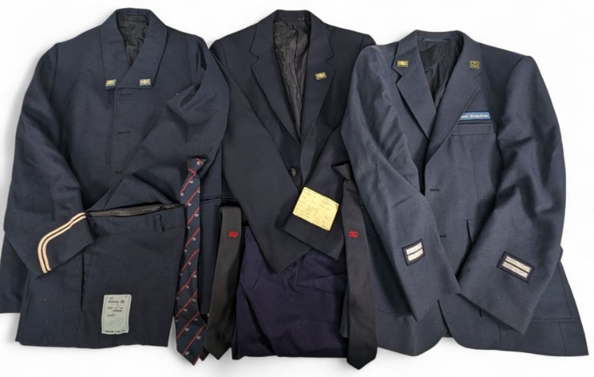 Old British Rail Uniform: Jackets Trousers assorted sizes and ages with a selection of badges patches three jackets one a ticket examiner, and two pairs of trousers and three ties some unused