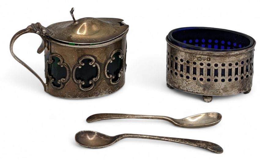 1910 Willian Henry Birmingham Silver Cruet part set with green glass liner and Chester 1910 cruet with blue glass liner and 2 small spoons, both hallmarked 66g
