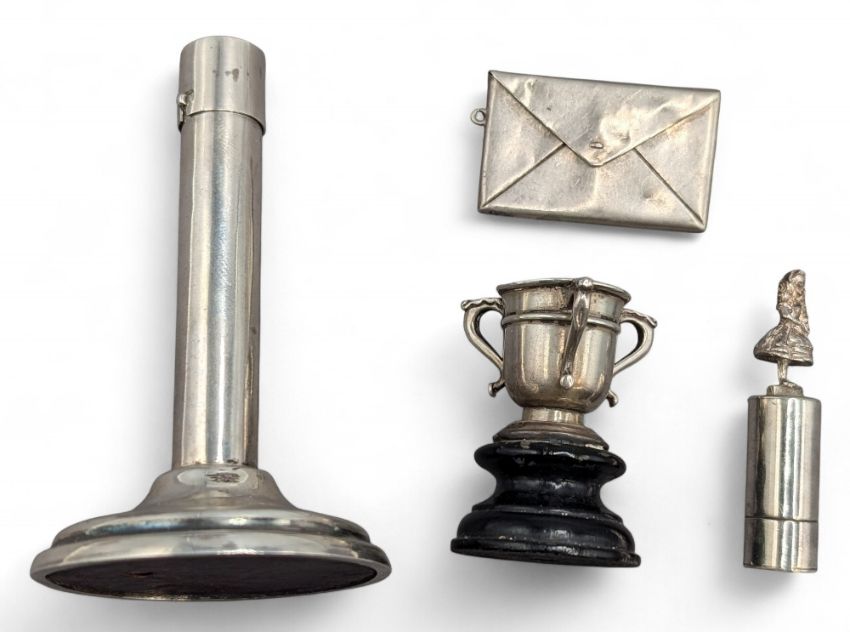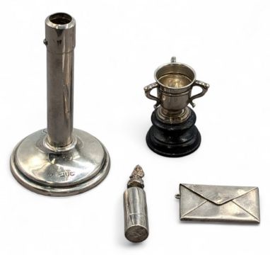 Silver Collectables, a small pill box London 1999 with girl figure to its top, a weighted single candle holder, a sterling silver stamp holder, and a miniature silver trophy