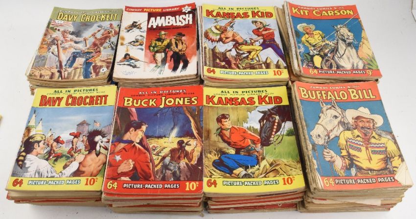 Great Collection of 1950s Cowboy Picture Library Featuring Kid Carson, Davy Crocket, Kansas Kid, Buck Jones all having 3-digit numbers or less (box)