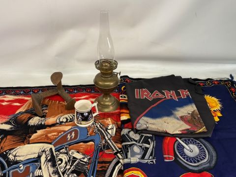 Brass & copper Oil Lamp, with its glass funnel, Lion brand shoe last, Apollo moon landing mug (handle damaged) with a Metallica fabric hanger, two motorcycle rugs