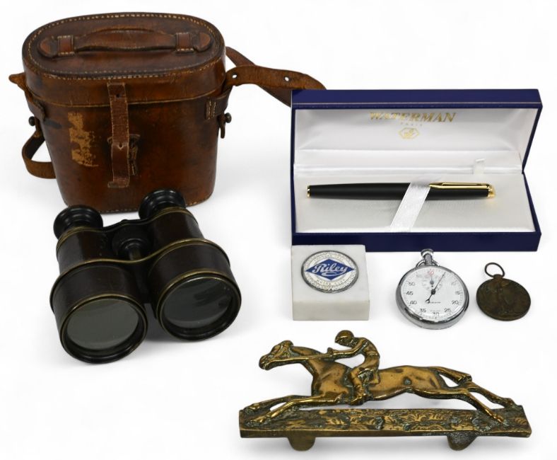 Vintage Binoculars Fred Archer Horse Racing Legend in Leather case together with Waterman Fountain Pen, Stop Watch, Brass Racing Horse & Jockey ornament, Riley Car Paperweight, WW1 Victory Medal 3822 H W Page R N V R