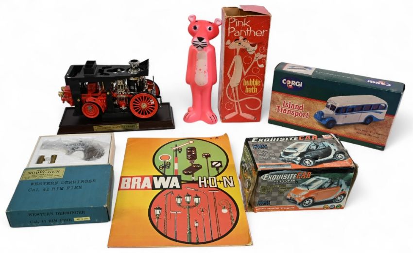 Selection of Toys to include Franklin Mint 1912 Christie Front Drive Steamer, Rosedale Pink Panther Bubble Bath boxed with contents, Modal Gun Western Derringer, Exquisite car, Corgi Island Transport Bedford Coach (box)