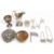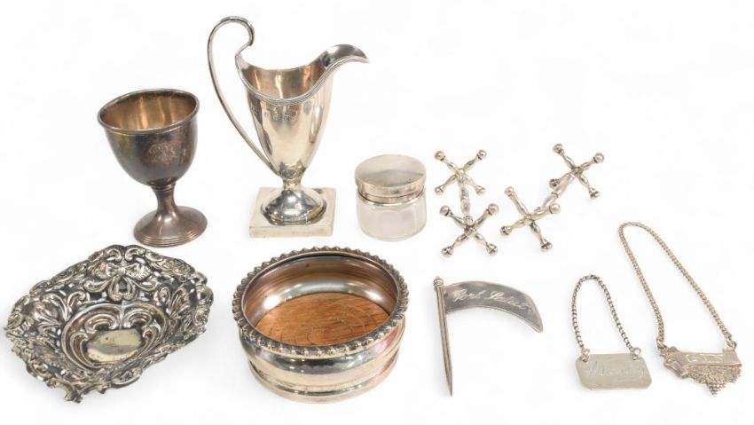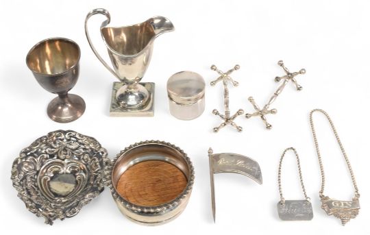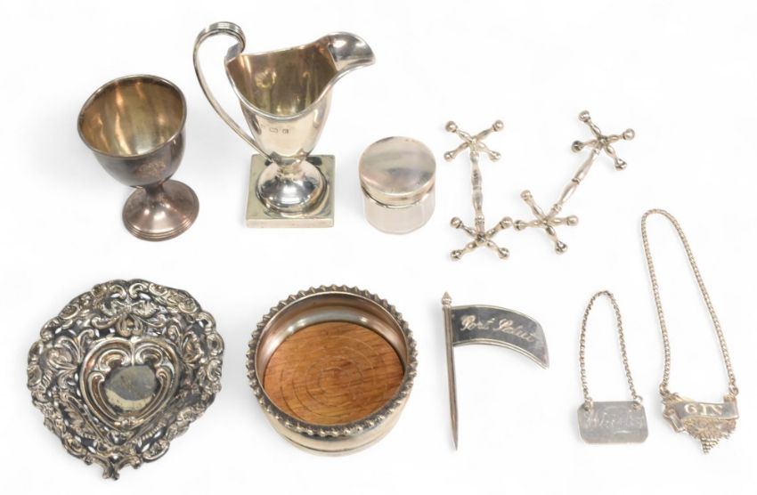 Selection of Hallmarked Silver to include small sauce jug, pair of knife rests, pin dish, egg cup, small silver topped glass pot, wooden based coaster, 3 miniature wine bottle labels port, gin, whiskey - 170g