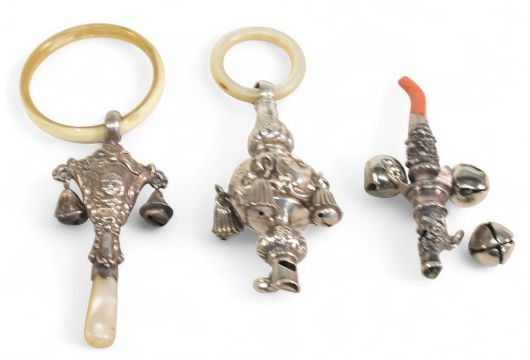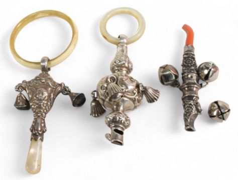 Silver Baby Rattles / Soothers 3 examples Birmingham 1920, Chester 1905, together with an unmarked white metal example (3)