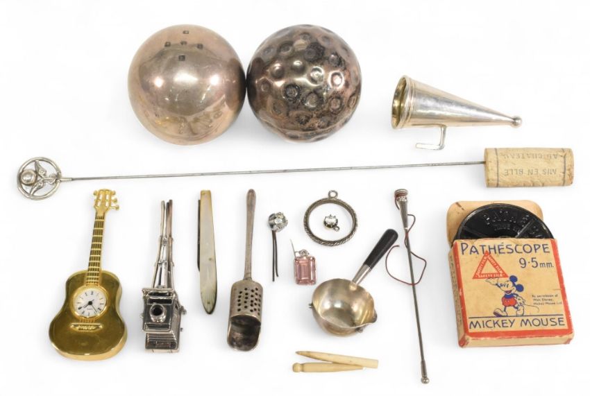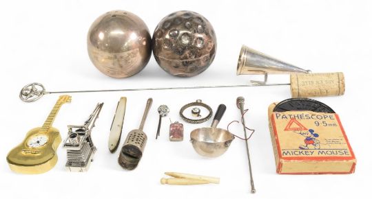 2x Hallmarked silver weighted balls, Golf ball and smooth example together with some white metal items: candle snuffer, spoons, plated camera on tripod, Mickey Mouse film (box)