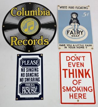 Retro Enamel Signs, Fairy Soap you have a little Fairy in your Home 25 x 18cm, Please No Singing No Dancing No Swearing this is a Respectable House 22 x 13cm, Don't Even Think of Smoking in Here 25 x 17cm, Columbia Records 29 cm dia