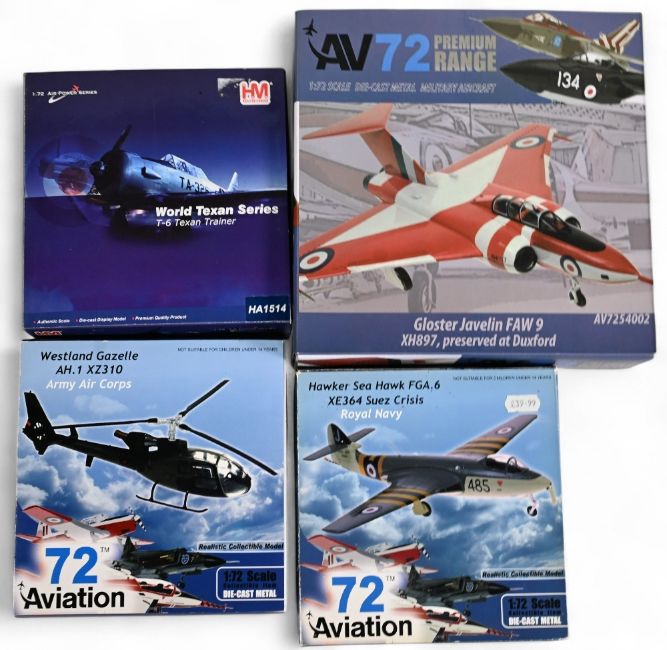 Selection of Diecast Airplanes to include 72 Aviation Hawker Sea Hawk FGA. 6, Westland Gazelle AH. 1 XZ310, AV7254002 Gloster Javelin FAW 9 together with Hobby Master HA1514 T-6 Texan Trainer all boxed (box)