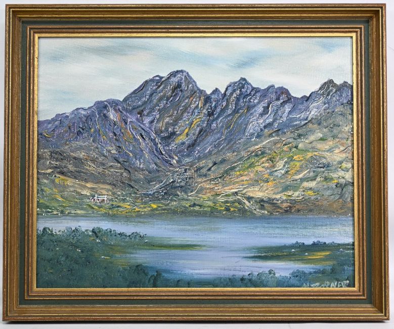 Oli Painting on Board Heavy painted mountain scene by M Turner framed in a gilt frame 59 x 49cm
