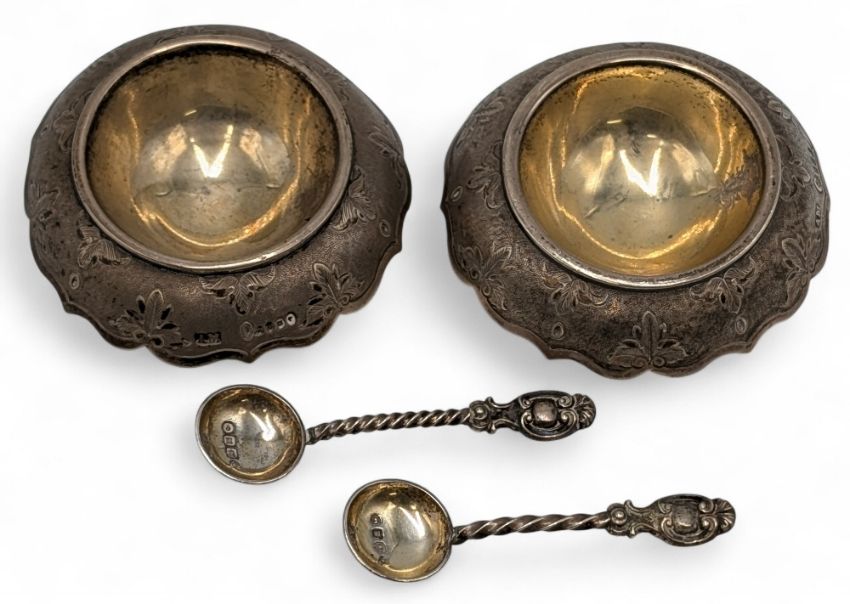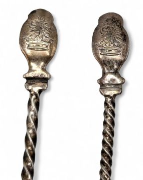 1867 Alexander Macrae Victorian Silver pair of cruets with matching spoons - these having engraved lions head (coat of arms) to backs 87g