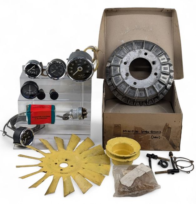 Vintage Leyland Mini & Other Makers Car Parts, a mixed lot of light used and unused Minifin brake drums, ignition and starter switch, Smiths rev counter (used) SU card parts, Smith fuel gauge, temperature gauge, oil gauge and yellow painted fan off a mini
