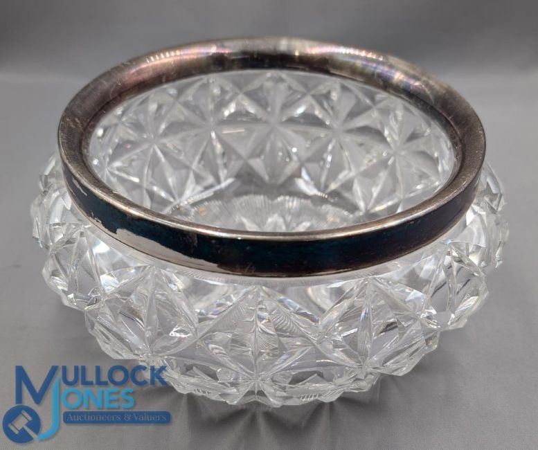 Matching pair of Birmingham Hallmarked Candlesticks 1967. Short dressing table sticks 10cm (total weight 261g weighted bottoms) together with moulded glass bowl with Elkington Plate Rim (3)