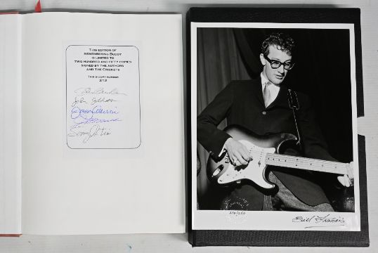 Limited edition book called "Buddy Holly: Remembering Buddy", limited to 250 copies numbered 212/250 and signed by the Crickets & Authors in slip case, together with signed Buddy Holly Photograph by Bill Francis 1930-2010