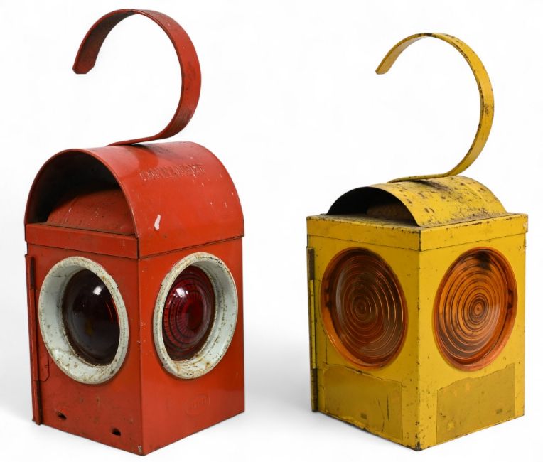 Pair of Vintage Council Road Work Paraffin Lamps, in yellow and red with the red one having its burner fittings - good clean condition