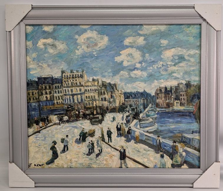 J Kent original Oil Impressionist Painting, street and town river scene with period horse carts, on canvas - framed #63cm x 73xm