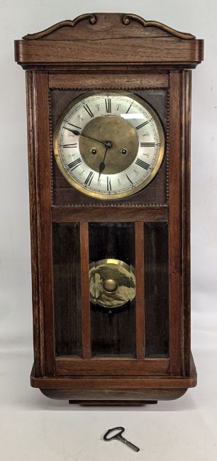 Edwardian Mahogany Wall Clock, with pendulum and key - some signs of repair to top of case