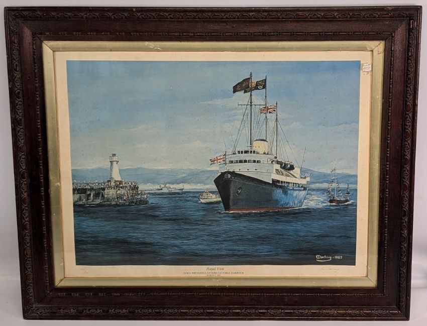 HMS Britania Royal Visit Victoria Harbour Print, signed by artist K Darling limited edition 138/500 - framed under glass 65cm x 81cm