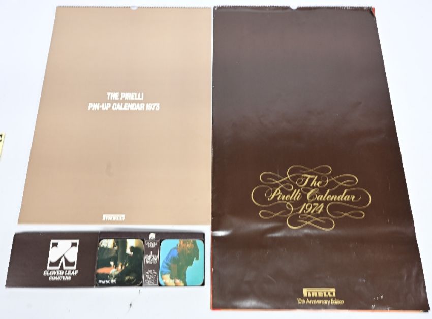 The Pirelli Pin-Up Calendar 1973 and 1974, 1973 risqué boxed Pirelli calendar 17"x24". This rare edition by Art Director Derek Forsyth commissioned photographer Duffy, pop artist Allen Jones and airbrush artist Philip Castle. It showcases 12 glossy girl photographs with pencil sketch prints on reverse of each image. The airbrushing techniques used producing this calendar were incorporated on the David Bowie Aladdin Sane album cover in 1973. The calendar includes the models: Nicky Allen, Kari Ann, Erica Creer, Elizabeth, Kate Howard, Nicki Howorth, Kubi, Jane Lumb, Sue Paul, Penny Steele, Vida, and Vicky Wilks. The 1974 edition was a showcase for everything the Pirelli Calendar had come to represent since its debut 10 years earlier. A tropical beach location - the Seychelle Islands. A cast of beautiful women - models Marana, Chichi Nou and twin sisters Kim and Eva Nielsen. And photography that was bold and often surprising. The man behind the camera was Hans Feurer and his pictures illustrate what makes him such an exciting and innovative photographer. The 1974 Pirelli Calendar was shot in the Seychelles by Swiss photographer Hans Feurer, who excelled at using light and shade to create extraordinary effects. Here the shadows cast by palm trees overhead look like zebra stripes on model Marana's bare skin. Together with a set of Clover Leaf Pirelli Girl Coasters (3)