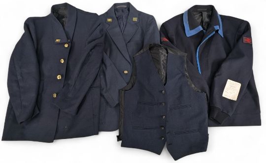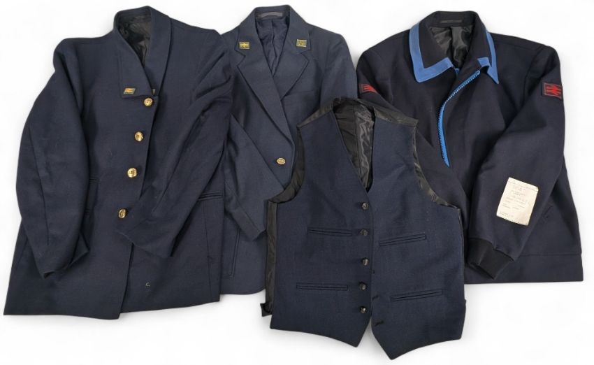 Old British Rail Uniform: Jackets, Overcoat, Waistcoat: two jackets, a waistcoat and jacket overcoat, assorted sizes some unused