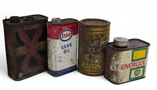 Vintage Oil Automobile Advertising Tin Can, to include examples of IMC, fluid, for the Ford Company, Esso gear oil, BP Engergol, Enfo shock absorber fluid for the Ford Company, Redex tin early example, missing caps, Castrol gear oil, Radio carbide calcium tin for cycle, and motor lamps (worn) (7)
