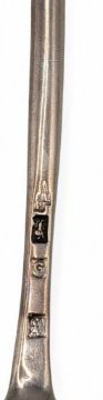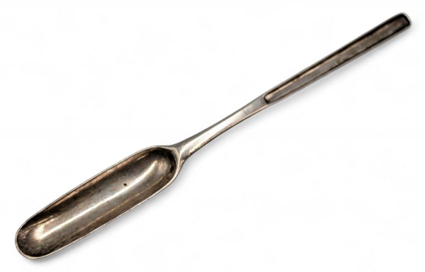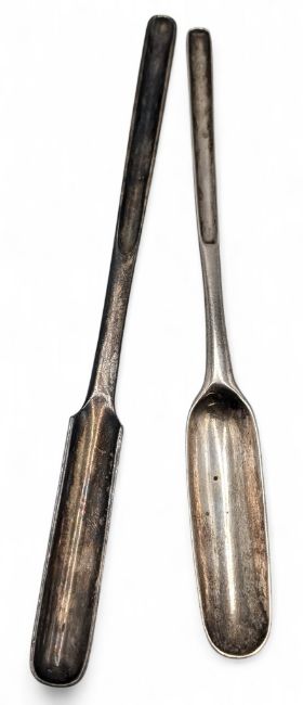 George I Silver Marrow-Scoop 1722, maker's mark rubbed, E? P, London - of typical form, the back of the larger end, 19.5cm long weight 40g, with a later silverplated marrow scoop 21cm long