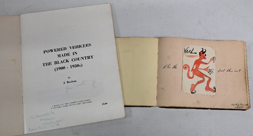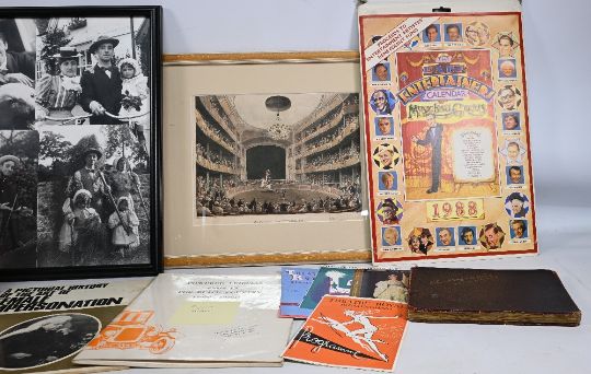 Music, Entertainment & Ephemera - an assorted selection to include 1905 dated autograph album depicting hand drawn sketches some in colour, poems and autographs wonderfully presented, t/w Astley's Ampitheatre c.1808 print, Dan Leno framed display, A Pictorial History of the art of Female Impersonation, 1988 Entertainers Calendar, Signed copy of Powered Vehicles Made in The Black Country (1900-1930s), and a selection of books (10) such as Pantomime, Lost Empires, The Golden Age of Pantomime, I scream for Ice Scream, The Melodies Linger On et al - varying conditions - Box