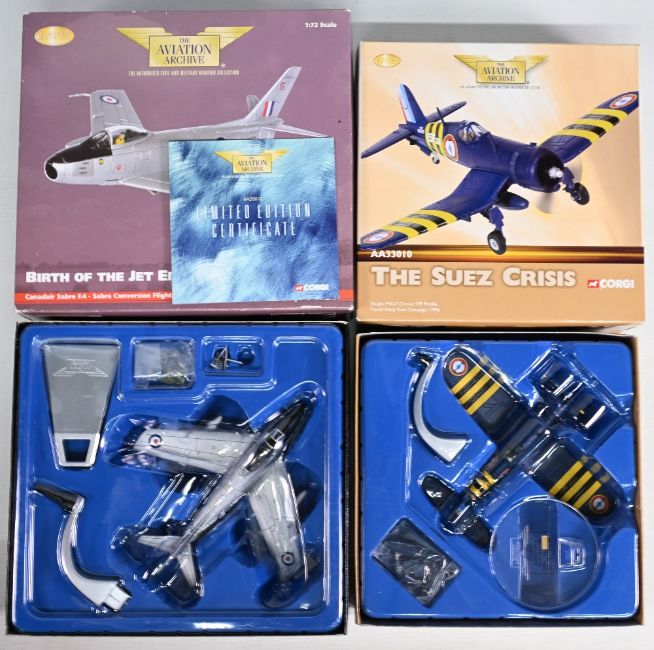 Corgi Aviation Archive Collector Series AA33010 F4U-7 Corsair I5F French Navy Suez Crisis AA36002 British Aerospace Hawk T.1A, AA35211 P-40E Warhawk, AA35812 Canadair Sabre F4 (4)