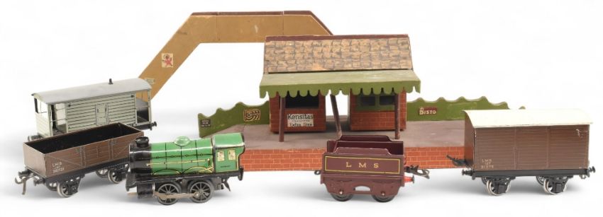 Hornby Clockwork O Guage to include Locomotive and odd LMS Tender, 3Rolling Stock, Wooden Station and Bridge (box)