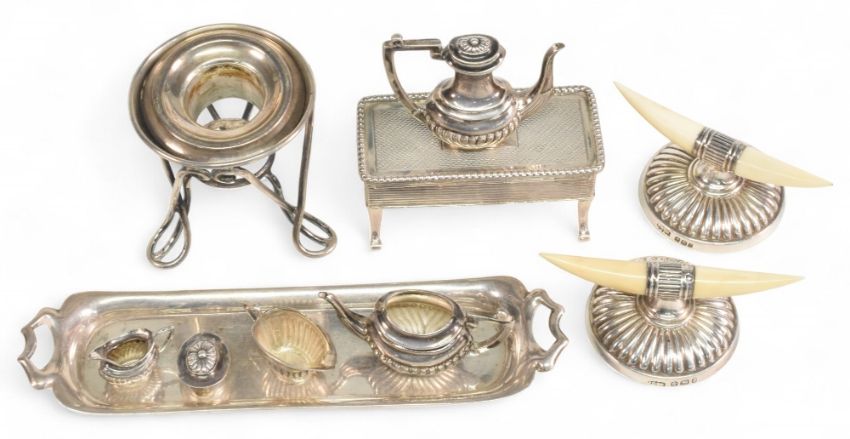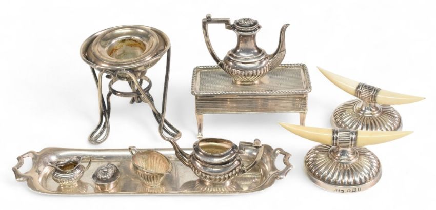 Selection of Hallmarked Silver to include miniature tea set on tray, single candle holder, 2 ornate horn design knife rests, ring box 180g