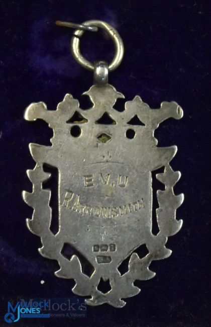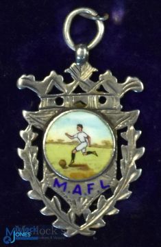 Football medal: 1908 Silver/enamel Manchester Amateur football league award, to the obverse the medal features a footballer kicking a ball, to the reverse it has the name R Arrowsmith with the letters E V U engraved thereon and hall marked silver; c/w the original box