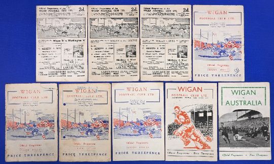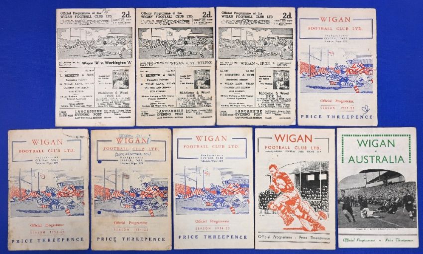 Nine Wigan rugby league home programmes 1952-1959 to include 51/52 Workington 'A' St Helens Hull 52/53 Workington 'A' 53/54 Whitehaven 'A' 54/55 Barrow 'A' Leigh 'A' 56/57 Australian Touring team 59/60 Australia Fair-Good condition with some small paper loss worn edge rusty staples marks additional writing fold creases