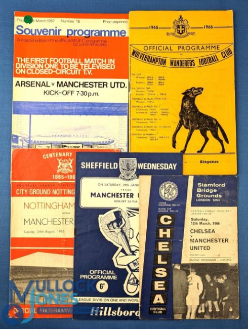 1965/1966/1967 Manchester United Away Football Programmes: 1965 Nottingham Forest, 1966 v Wolves, Sheffield Wednesday, Chelsea, Arsenal - the first match on closed circuit TV