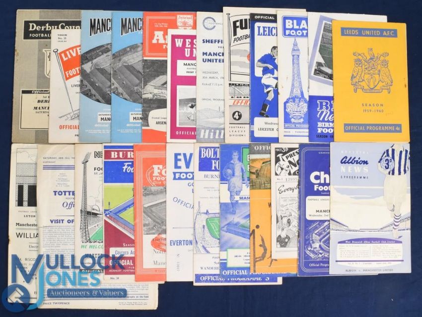 1959/60 Manchester Utd complete league season of away match programmes (21) plus Manchester City (friendly 12 March 1960), Liverpool (FAC 4th round), Derby County (FAC 3rd round); fair/good. (24)