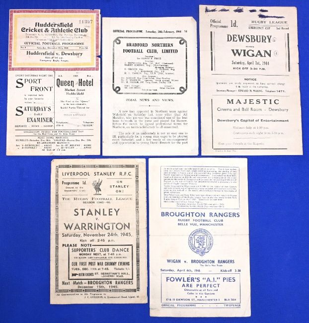 Five wartime Rugby League programmes to include 43/44 Huddersfield v Dewsbury Bradford Northern v Featherstone Dewsbury v Wigan 45/46 Liverpool Stanley v Warrington Broughton Rangers v Wigan Fair/Good condition