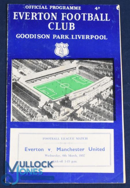 1956/57 Everton v Manchester Utd Div. 1 match programme Wednesday 6 March 1957; slight mark, team changes; overall fair. (1)