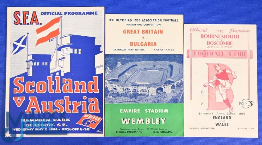 1956 Scotland v Austria international friendly match programme at Hampden Park 2 May 1956, 1956 Great Britain v Bulgaria Olympics qualifying football match programme at Wembley, 1955 England v Wales amateur international match programme 23 April 1955 at Bournemouth; good. (3)