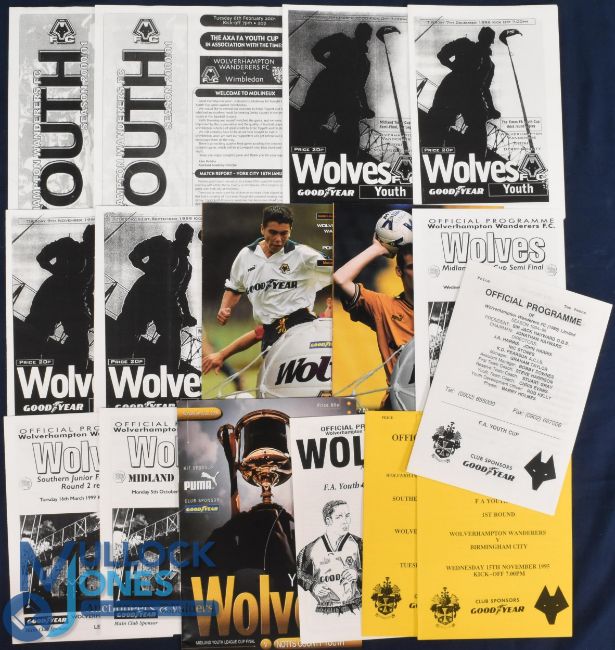 Wolverhampton Wanderers home youth match programmes 1994/95 Cambridge Utd, 1995/96 Birmingham City, Coventry City (Southern jnr cup), 1996/97 Wycombe Wanderers; 1997/98 Notts. County (Midland youth final), 1998/99 Notts. County (Midland youth), Leyton Orient (Southern jnr cup), WBA (Midlands youth s/f), Walsall (Midlands final), Portsmouth (Southern jnr. Final), 1999/2000 Shrewsbury Town (Midland youth), Walsall (Midland Cup), Derby County (FAYC), Mansfield Town (Midland Cup s/f), 2000/01 Wimbledon (FAYC), York City (FAYC); fair/good. (16)