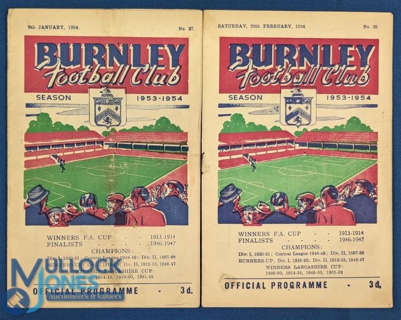 953/54 Burnley v Manchester Utd Div. 1 match programme 20 February 1954 at Turf Moor (good); Burnley v Manchester Utd FAC 3rd round match programme 9 January 1954 crease, fair; (2)