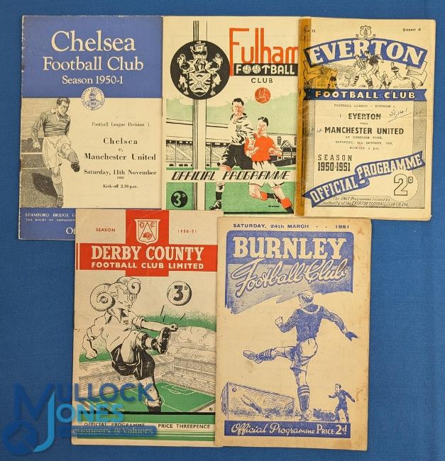 1950/51 Manchester Utd away match programmes to include Burnley, Derby County, Everton (Sellotape spine, overall poor), Fulham, Chelsea; fair. (5)
