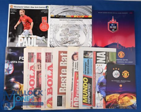 2011/12 Manchester Utd complete league season away programmes (19); FAC aways at Manchester City, Liverpool; Carling Cup away at Leeds Utd, Aldershot; Champions League aways v Otelul Galati (fold out issue similar to a fan), Basel, Benfica (A Bola newspaper - day of match), Benfica (A Bola newspaper—day after match with report/photos), Benfica (O Benfica newspaper - preview of match days before); Europa League Ajax (official), Ajax (pirate), Atletico Bilbao (newspaper Beste Bat 15 March 2012), Atletico Bilbao (newspaper Mundo Deportivo on day of match): tour match v MLS All Stars (in New Jersey); Community Shield v Manchester City (7 August) also Manchester Utd v New York Cosmos (Paul Scholes testimonial) (Cosmos included Gary Neville, Sol Campbell, Patrick Viera, Nicky Butt, Dwight Yorke, Robbie Keane) 5 August 2011; o/all good. (33)