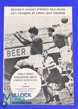 1957/58 Dukla Prague v Manchester Utd European Cup match programme 4 December 1957 at Prague, Czechoslovakia; team changes, o/wise good original condition. (1) NB: Programme cover photo shows Duncan Edwards and Allenby Chilton clearing the ball in the FA Cup match v Reading January 1955