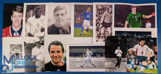 Signed Football Photographs, most 10 x 8 and 12 x 8 images - to include M Le Tissier, Emile Heskey, Harry Redknapp, Peter With, Steve Staunton, Kevin Keegan, Gary Lineker, Jimmy Hill, Rudd Gullitt, Alan Hansen, Robbie Fowler, Trevor Brooking (13)