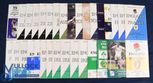 England Home/Away Rugby Programmes 1958-2000 (32): Homes v NZ 1964, 67, 73, 78 and 79; v S Africa 61; v Australia 58 and 97; v Scotland 67, 71 (A, Centenary), 77, 78 (A) and 83 (taped etc); v France (Homes) 67-77 inc, 81 and 83; v Ireland (H) 60-64 inc, 68, 76, 78, 84, 88 and 2000; v Romania 85 and President's XV 84. Otherwise VG/Excellent.