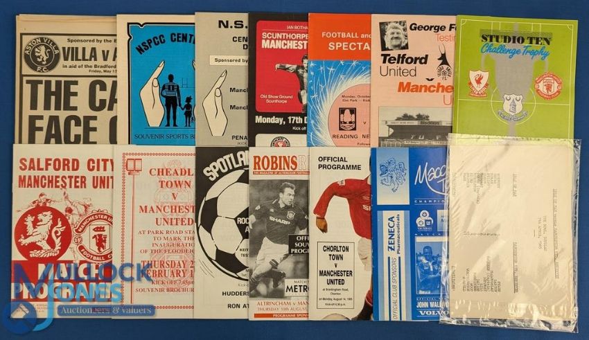 Selection of football programmes Manchester City v Manchester Utd former players (Book, Bell, Summerbee - Foulkes, Kidd, Charlton) at Altrincham, NSPCC centenary fund raiser and NSPCC centenary souvenir sports brochure and football flyer, Altrincham v Doncaster Rovers FAC 8 December 1984 match, 1984 Scunthorpe Utd v Manchester Utd (Ian Botham benefit), 1984 Reading v New Zealand friendly (George Best for Reading), 1984/85 Bradford Disaster appeal Aston Villa (including George Best) v WBA (newspaper type), 1985 Huddersfield Town v Don Atkinson XI at Rochdale (Keith Hanvey testimonial), 1985 Isle of Man v Manchester Utd reserves single sheet, 1990 Studio 10 Manchester Utd v Everton, Manchester Utd v Liverpool double issue: 1994 Macclesfield Town v Manchester Utd, 1995 Cheadle Town v Manchester Utd, 1992 Salford City v Manchester Utd, 1995 Telford Utd v Manchester Utd friendly; fair/good (14).