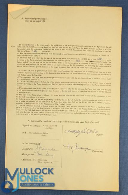 1968/69 Chris Price Player Contract signed for Birmingham City, printed and completed by hand, witnessed etc